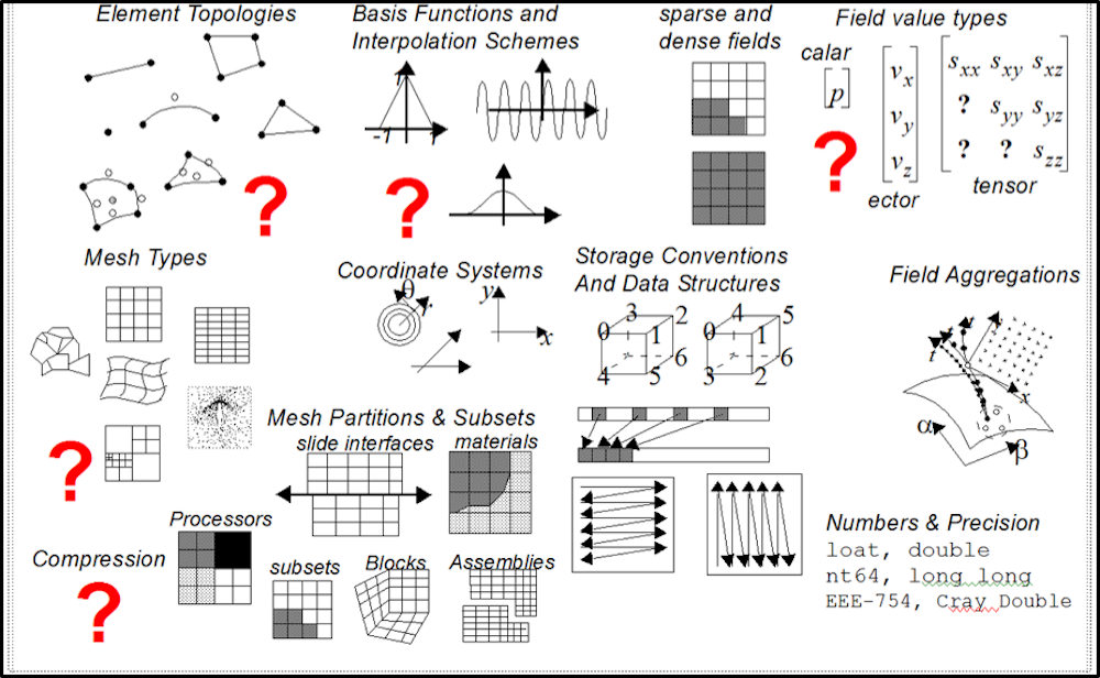 The pictures here (click to enlarge them) illustrate that mesh-based scientific data has a well defined data model, is highly structured and often rich and diverse in logical, geometrical and mathematical relationships. This is in stark contrast to unstructured text and key-value pairs typical of Big Data workflows.